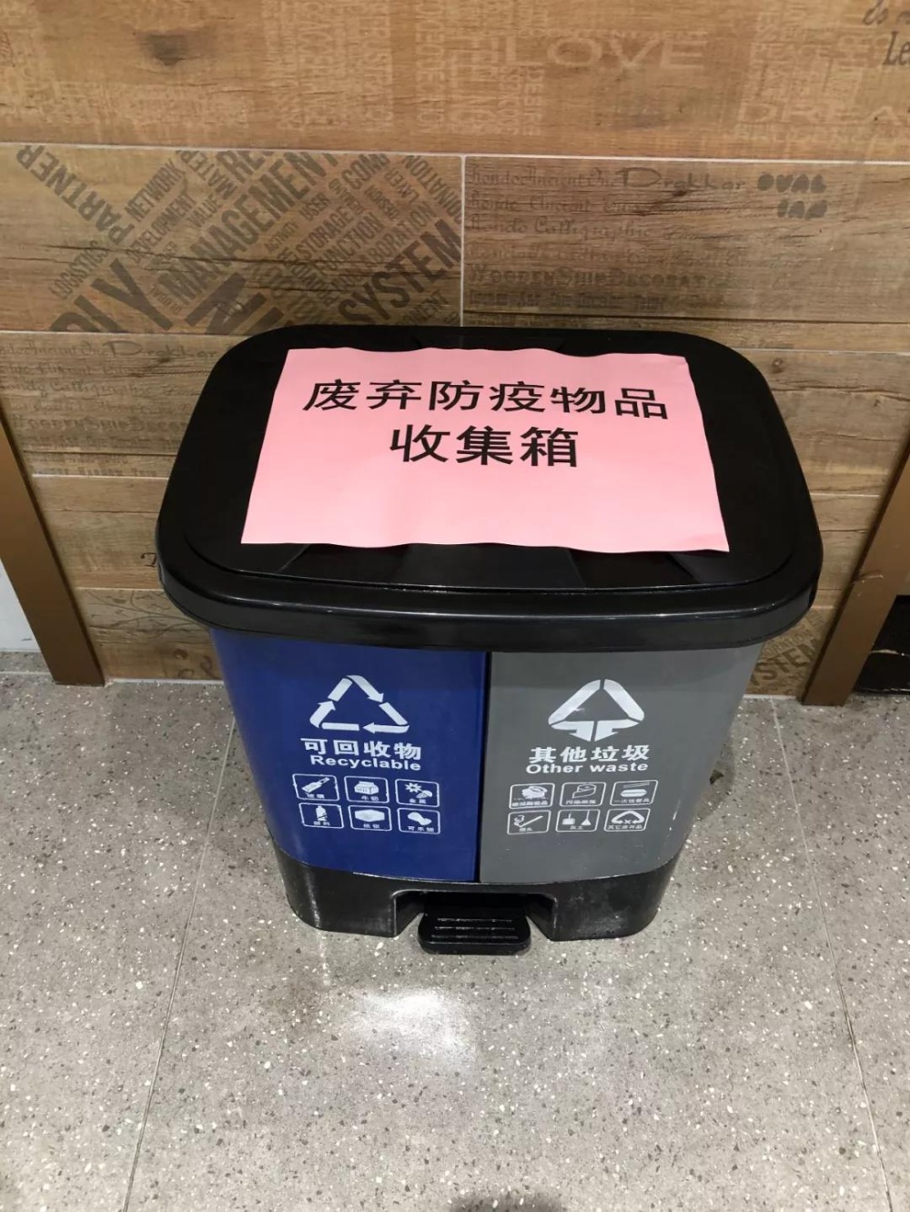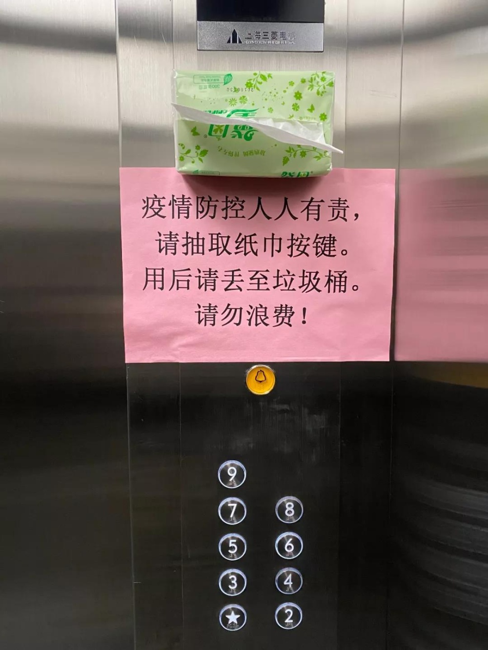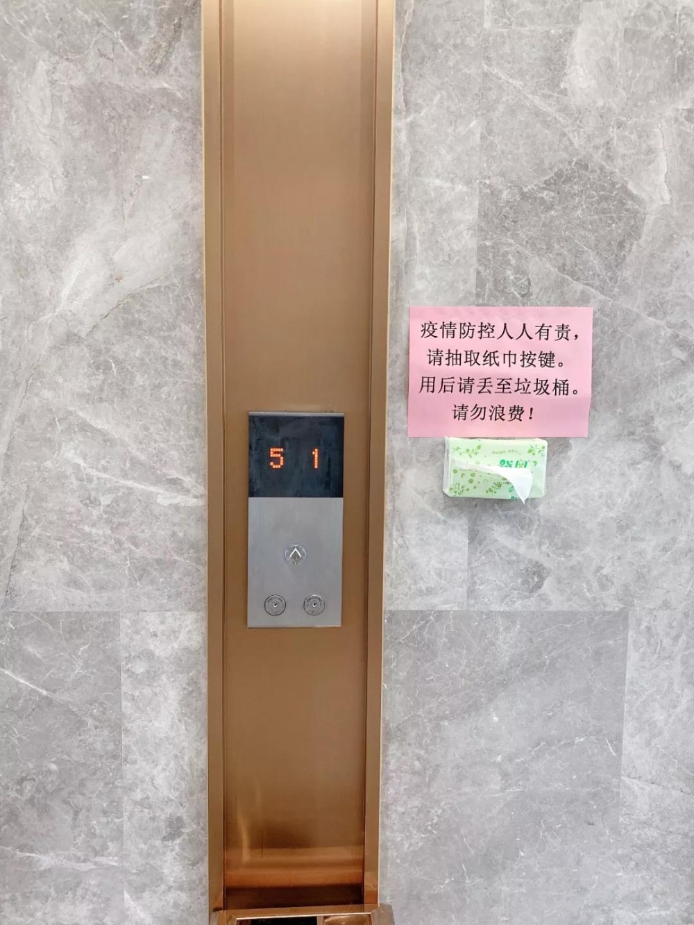 各樓層配備消毒物品及用具,每層電梯廳及電梯放置紙巾用于按電梯按鈕,設置廢棄防疫物品專用垃圾桶。