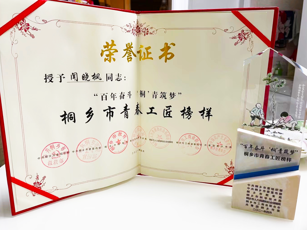 4月29日下午,桐鄉(xiāng)市舉辦“百年奮斗 桐青筑夢(mèng)”桐鄉(xiāng)市百名青春榜樣表彰大會(huì)暨慶祝中國(guó)共產(chǎn)黨成立100周年主題團(tuán)日活動(dòng),我集團(tuán)聞曉楓榮獲“青春工匠榜樣”。