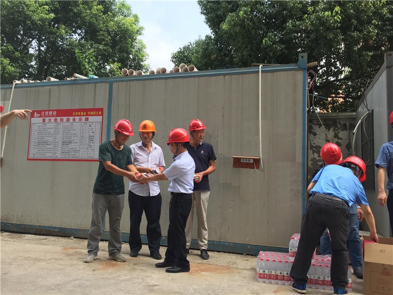 入伏以來(lái),為保障項(xiàng)目的按時(shí)完工,我公司世紀(jì)路學(xué)校項(xiàng)目部的施工人員頂著酷暑依然奮斗在施工現(xiàn)場(chǎng)。7月31日上午,市建設(shè)局黨委副書記許劍明和建管處主任陸偉杰為現(xiàn)場(chǎng)工人送上了礦泉水、毛巾、人丹、藿香正氣水等防暑降溫物品。