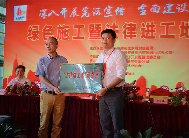 會議階段,首先由市開發(fā)區(qū)管委會副主任、高橋街道辦事處主任沈建良致辭。市司法局局長王正華對立信管業(yè)進(jìn)行“法律進(jìn)工地示范點”授牌儀式。立信建設(shè)董事長兼總經(jīng)理譚松坤、巨匠集團(tuán)和富力管理代表進(jìn)行交流講話,立信建設(shè)副總經(jīng)理勞月清對項目情況及工程亮點作了詳細(xì)介紹。市建設(shè)局局長、人防辦主任張富強(qiáng),市司法局、普法辦主任王正華分別作重要講話,最后由大會主持人市建設(shè)局副書記許劍明作總結(jié)發(fā)言。