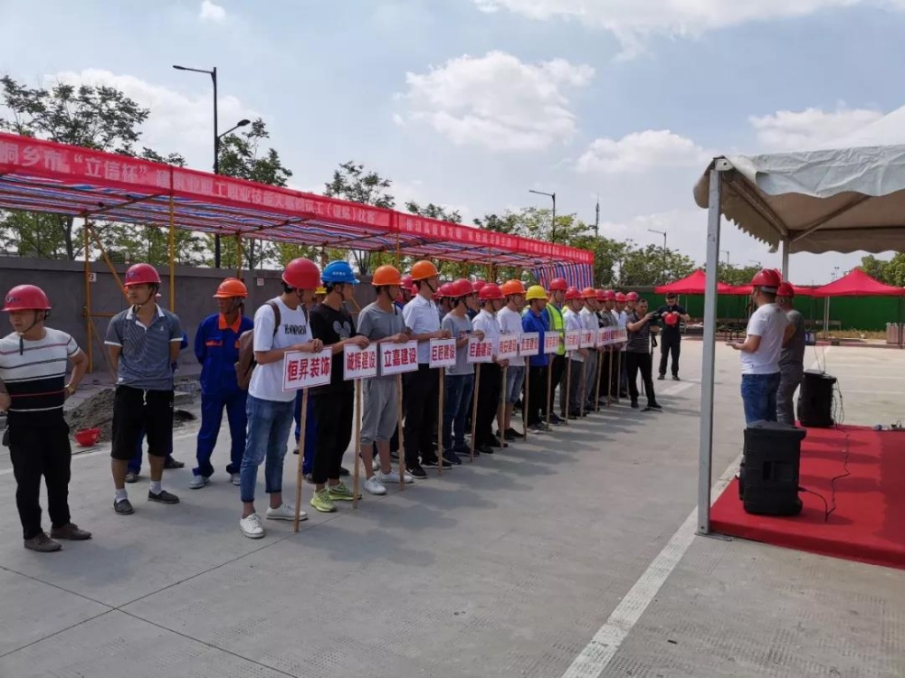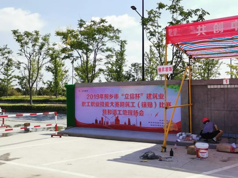今日,2019屆桐鄉(xiāng)市“立信杯”建筑業(yè)職工職業(yè)技能大賽砌筑工(鑲貼)比賽暨和諧工地現(xiàn)場會在我司錦程幼兒園項(xiàng)目工地上舉行。