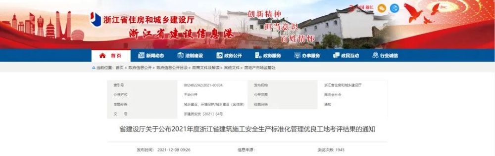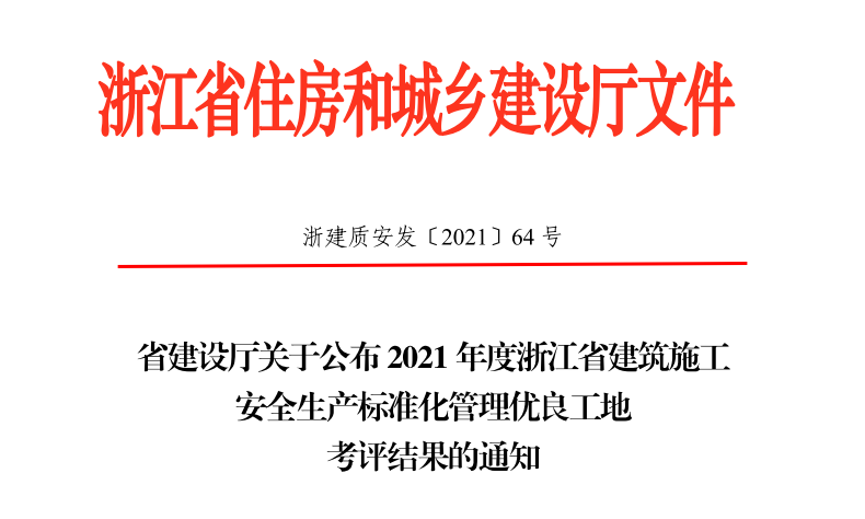 集團項目榮獲“2021年度浙江省建筑施工安全生產(chǎn)標(biāo)準(zhǔn)化管理優(yōu)良工地”稱號